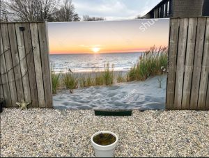 Tuinposter strand – tunnelzoom boven- en onderzijde – 2 ringen zijkanten – aluminium profielen